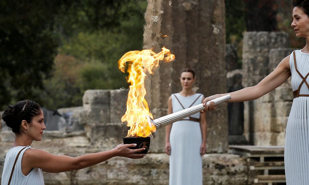 O fogo, que é ateado na pira olímpica no palco de abertura dos jogos, é aceso 100 dias antes do começo da competição, em Olímpia, na Grécia, a partir da luz solar. Antes de embarcar para a cidade-sede, a tocha acesa passa por algumas cidades gregas e outras localidades no país que receberá os jogos.