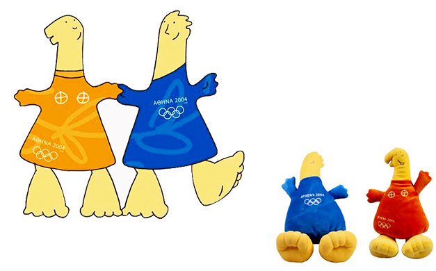 Os nomes dos mascotes vêm de dois deuses da mitologia grega. Phevos, outra referência a Apolo, é o deus da luz e da música, e Atena é a deusa da sabedoria e protetora da cidade de Atenas. A fisionomia dos mascotes se deve à inspiração na daidala, uma boneca de terracota do século VII A.C. na forma de um sino.