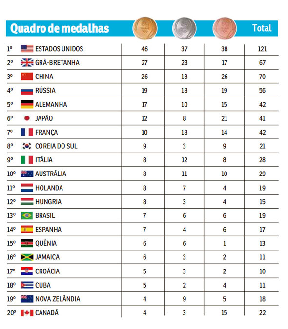 Entre os países participantes o líder geral da Olimpíada 2016 foi os Estados Unidos, com 121 medalhas (46 ouro – 37 prata – 38 bronze). Em seguida veio a Grã-Bretanha, com 67 (27 ouro – 23 prata – 17 bronze), e a China, com 70 (26 ouro – 18 prata – 26 bronze).
