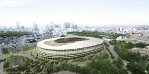 Os planos incluíam a demolição do Estádio Nacional, e a sua expansão para 80 mil lugares. No entanto, o primeiro-ministro japonês Shinzō Abe anunciou em julho de 2015 que o projeto de Hadid, fora descartado, devido aos altíssimos custos de sua construção. No outono de 2015, o arquiteto local Kengo Kuma apresentou o novo projeto do estádio. No projeto de Kuma, o estádio terá uma capacidade modular de 60 a 80 mil pessoas. Dos 33 locais de competições planejados, 28 estão localizados a apenas 8 km da Vila Olímpica, enquanto que foram construídos 11 novos locais.